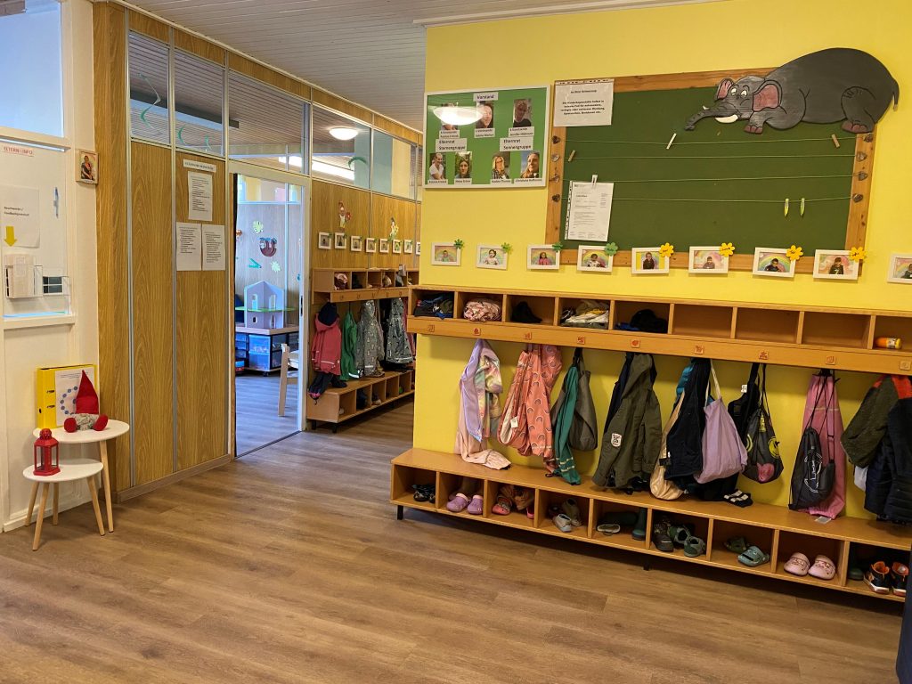 Jedes Kind hat seinen festen Platz in den Garderoben für seine Utensilien.